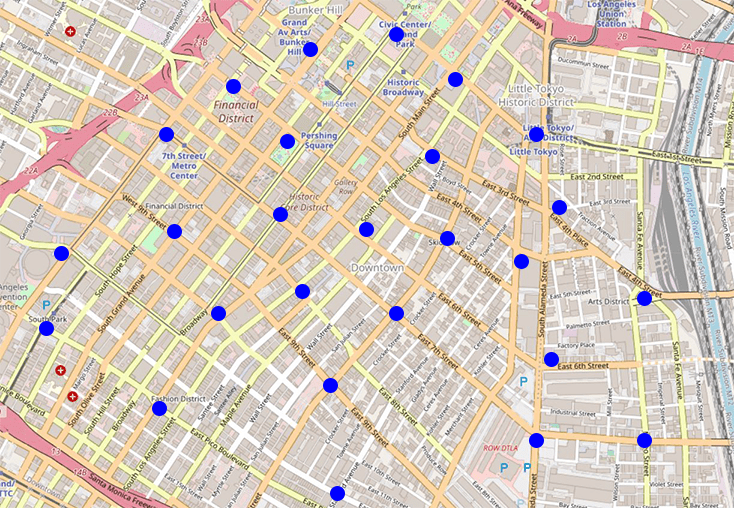 A network of these fountains could be piloted downtown, with an emphasis on skid row, to prove their viability for future expansion. Here is a map of 25 possible locations. They should have clear and bold signage alerting pedestrians of their presence.
