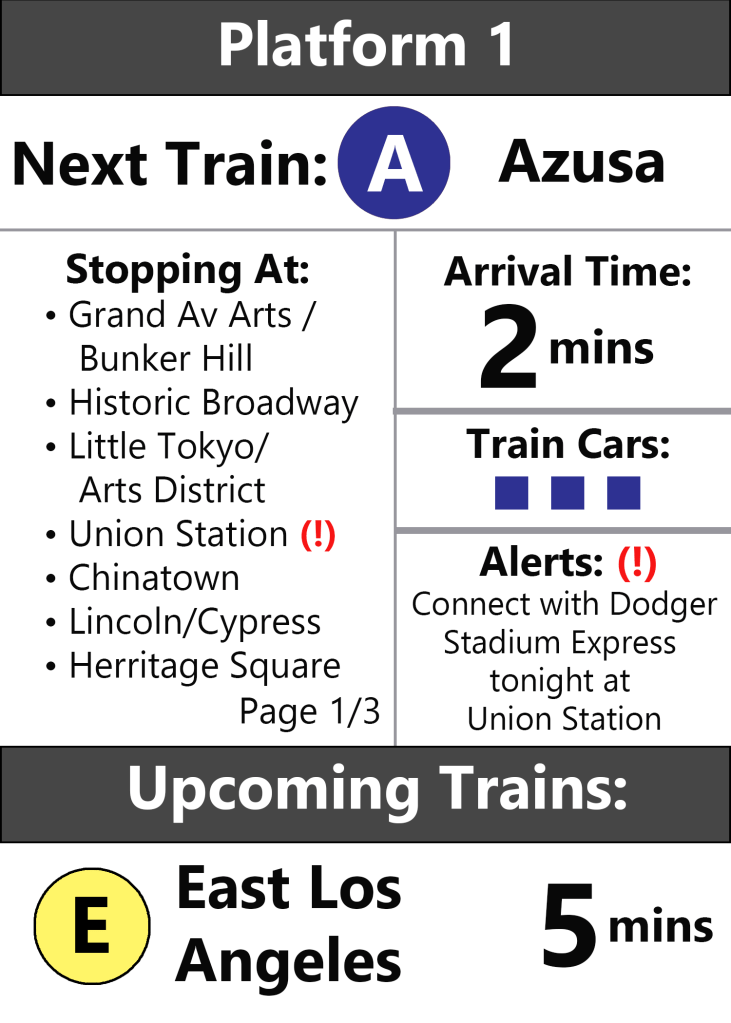 - Multi-lingual Everything. The signs I made are all in English, but the final versions should absolutely include multiple languages. I read somewhere over 200 languages are spoken in the City of Los Angeles, so why not include at least some of those in the stations? Especially Spanish which is spoken by millions of people in the region.